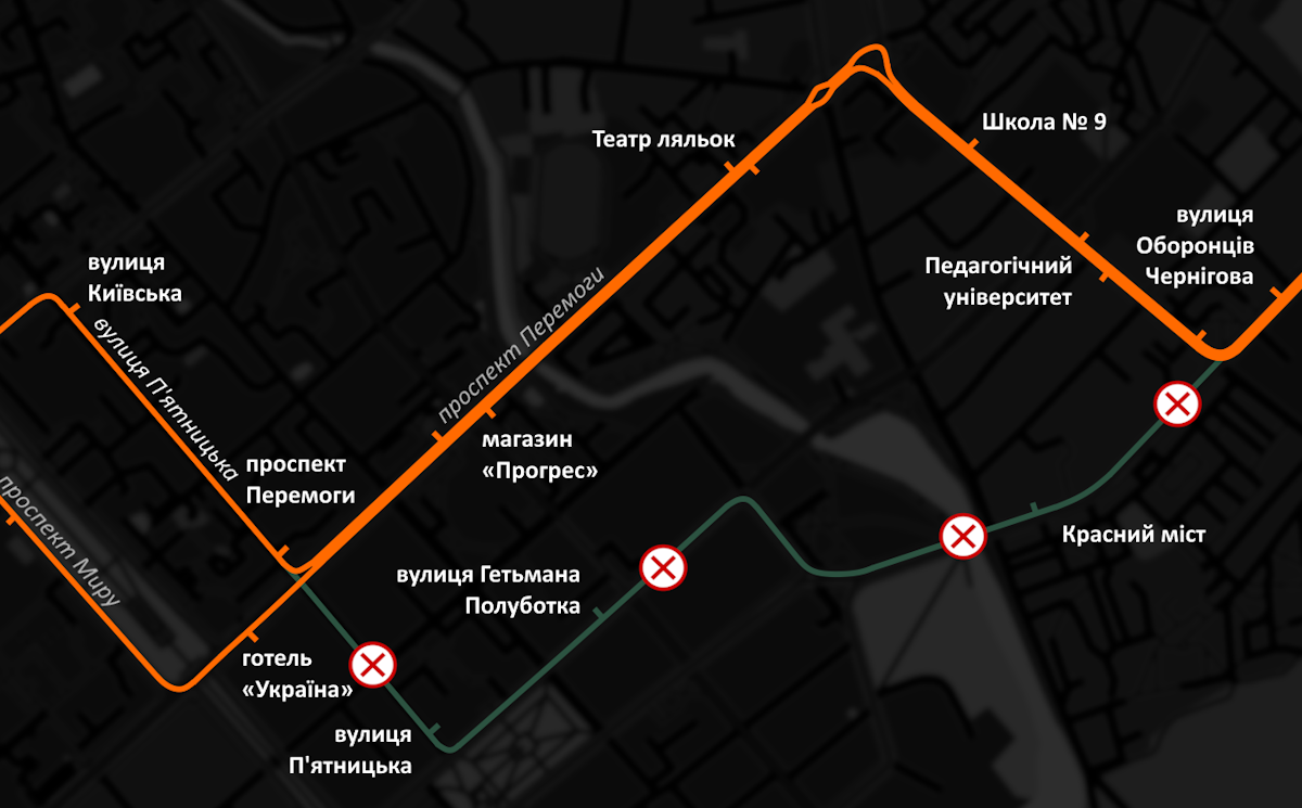 У напрямку кінцевої «мікрорайон „ШЕРСТЯНКА“» між зупинками «Парк культури та відпочинку» та «проспект Перемоги» прямує вулицею Оборонців Чернігова, П'ять кутів та проспект Перемоги і далі за основним маршрутом.
